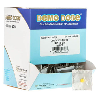 Demo Dose® Levothyroxn Sodim (Synthrod) 100 mcg is a simulated oral tablet designed to resemble Levothyroxine Sodium, commonly prescribed as Synthroid for thyroid hormone replacement therapy. This training tool helps healthcare students practice medication identification, administration, and patient counseling safely.